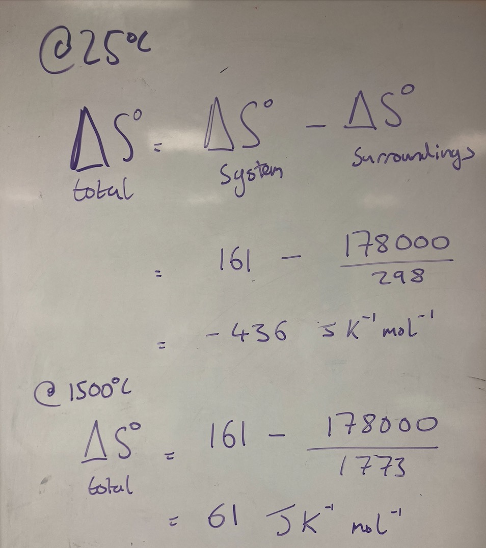 Calcium carbonate, present in limestone, is stable under normal atmospheric conditions. When it is in a volcanic area and it gets very hot, it can thermally decompose. Given the following information, use the Second Law of Thermodynamics to show why limestone is stable at 25oC, but not at 1500oC.