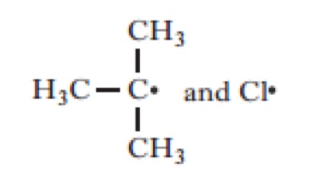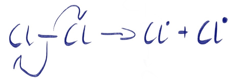 When a non-polar covalent bond is broken, one electron from the σ-molecular orbital moves back to each of the atoms from which the original bond was formed. This is what happens in the initiation step of the free radical chain reaction. This can be seen in the diagram below: