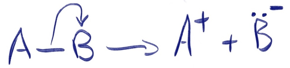 Heterolytic fission happens when polar covalent bonds are broken. On this occasion, both electrons are transferred to the more electronegative atom as in the example below: