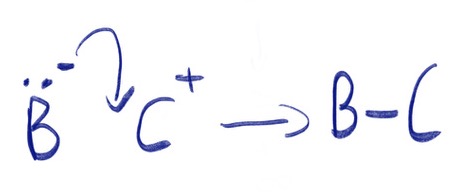 In the example above, the negatively charged atom 'B-' donate a pair of electrons to the positively charged atom 'C+'. Atom 'B-' is said to be acting as a nucleophile as it is donating electrons. Examples include Br-, OH- and NH3. Atom 'C+' is said to be acting as an electrophile as it is accepting electrons. Examples include H+, NO2+ and SO3.