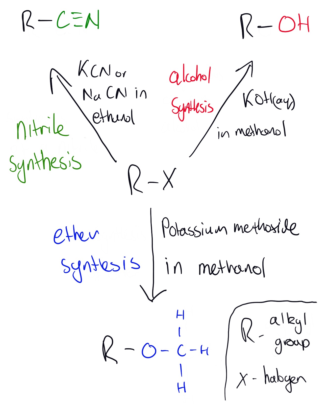 1. alcohols using aqueous alkalis as reagents 2. nitriles using ethanolic cyanide. Product can be hydrolised to form a carboxylic acid. 3. ethers using alcohlic alkoxides
