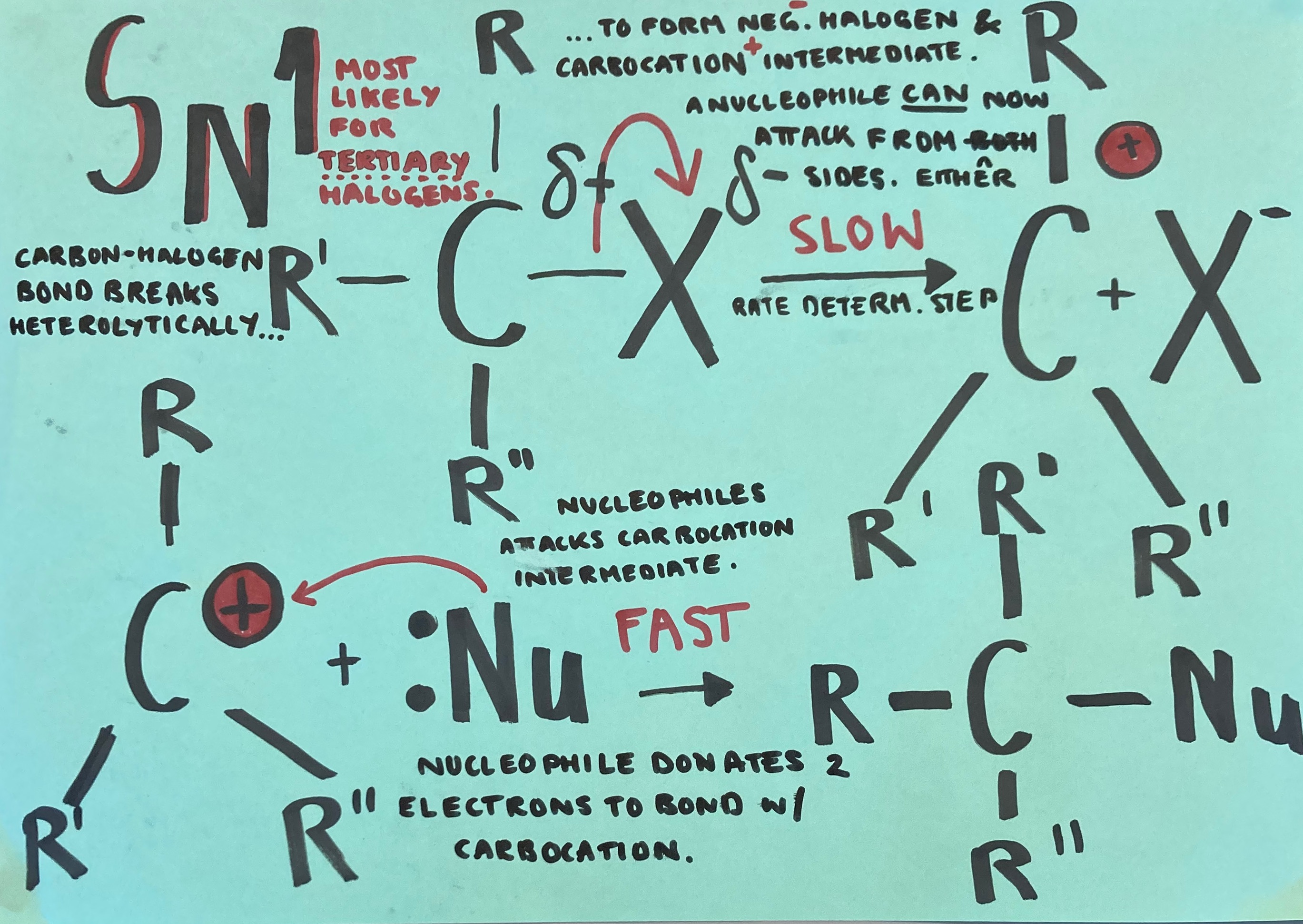 Explanations of Sn1 and Sn2 reaction mechanisms can be seen below.