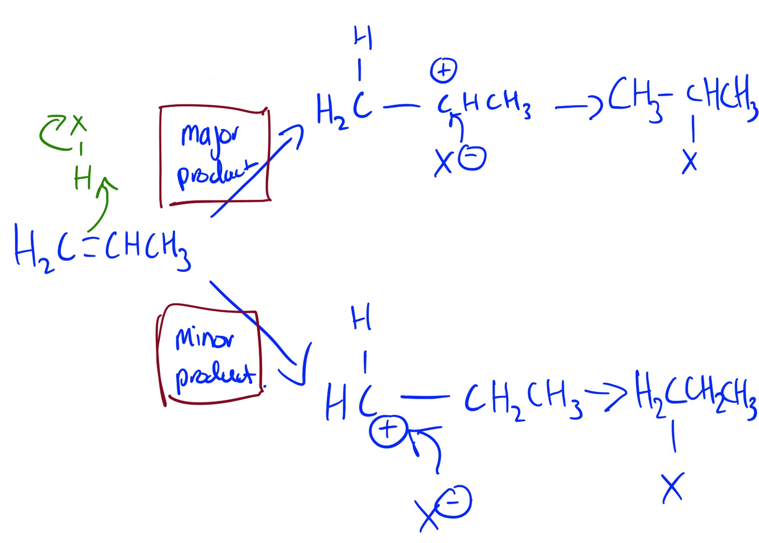 The major product is 2-halopropane. This is because it forms a more stable carbocation intermediate. This is an example of Markovnikiv's rule.