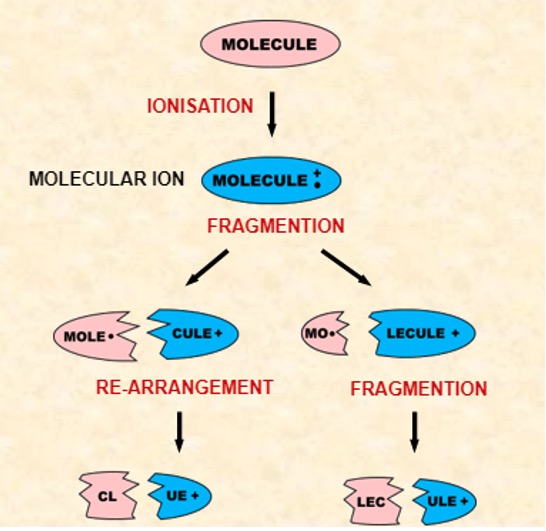 3. The molecular ion undergoes FRAGMENTATION or RE-ARRANGEMENT producing particles of smaller mass.