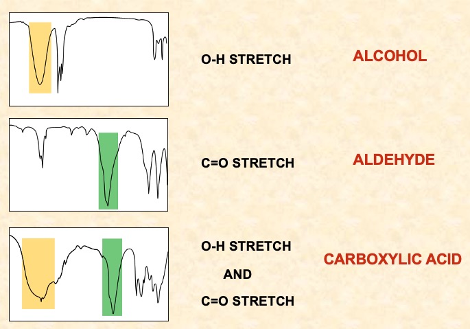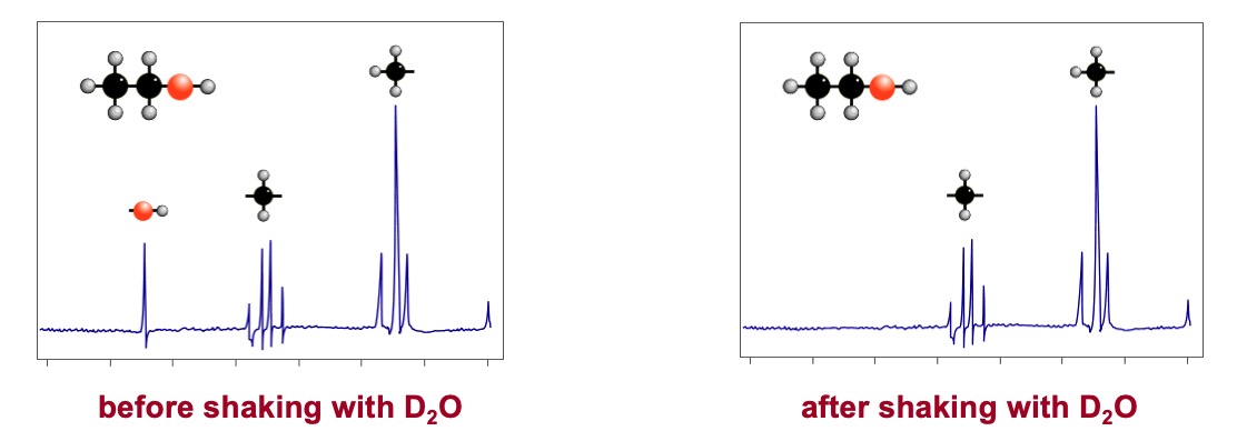It is possible to identify which signal is caused by the H of an O-H group by doing a 'D2O shake'. A small amount of deuterium oxide D2O, a form of water, is added to the sample and the spectrum is re-run. Any signal due to O-H proton disappears.
