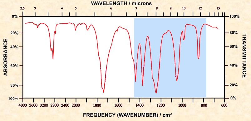 Organic molecules have a lot of C-C and C-H bonds within their structure. Spectra obtained will have peaks in the 1400 cm-1 to 800 cm-1 range. This is referred to as the 'fingerprint' region. the pattern obtained is characteristic of a particular compound the frequency of any absorption is also affected by adjoining atoms or groups.