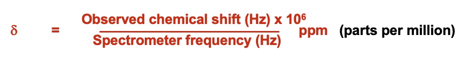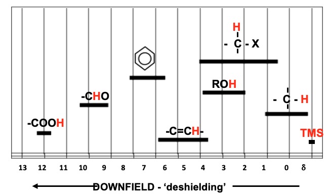 The chemical shift of a proton is constant under the same conditions (solvent, temperature). The TMS peak is assigned a value of ZERO (δ = 0.00). All peaks of a sample under study are related to it and reported in parts per million. H's near to an electronegative species are shifted 'downfield' to higher δ values.