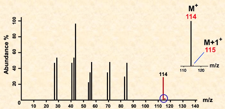 The small peak (M+1) at 115 due to the natural abundance (about 1%) of carbon-13. The height of this peak relative to that for the molecular ion depends on the number of carbon atoms in the molecule. The more carbons present, the larger the M+1 peak.