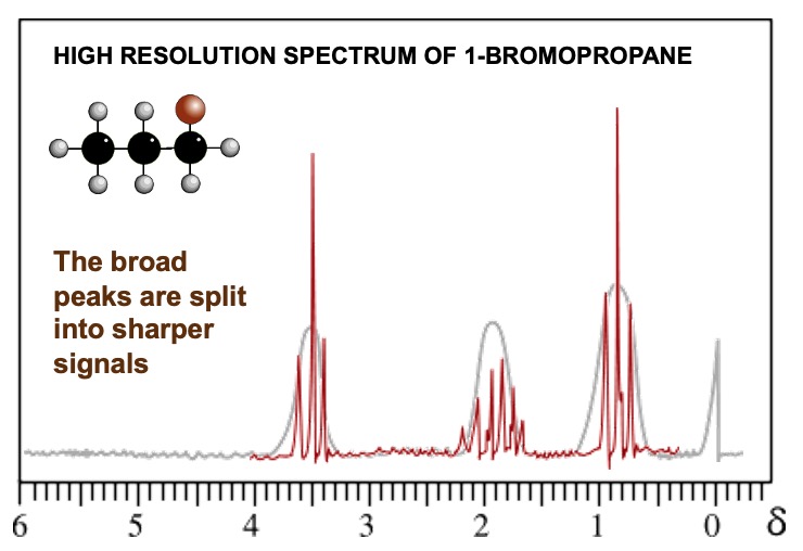 High resolution gives more complex signals - doublets, triplets, quartets, multiplets. The signal produced indicates the number of protons on adjacent carbon atoms.