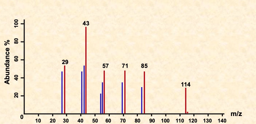 In the spectrum of octane, a signal occurs at 114 due to the species C8H18+