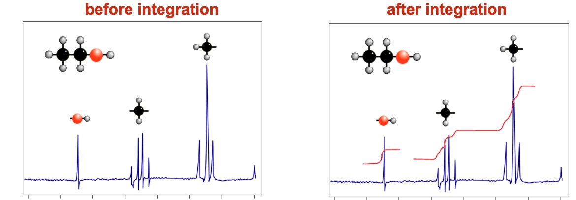 The area under a signal is proportional to the number of hydrogen atoms present. An integration device scans the area under the peaks. Lines on the spectrum show the relative abundance of each hydrogen type (old method). Computers now display the information as numerical data.