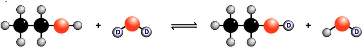 The H in the O-H bond changes places with a deuterium atom, 2H or D, from D2O.