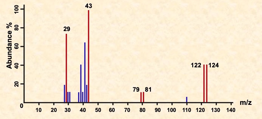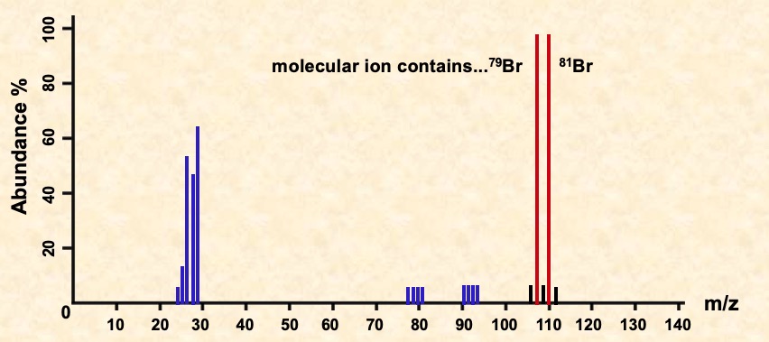 Multiple peaks occur in the molecular ion region due to different halogen isotopes. There are two peaks for the molecular ion of C2H5Br, one for the molecule containing the isotope 79Br and the other for the one with the 81Br isotope. Because the two isotopes are of similar abundance, the peaks are of similar height.