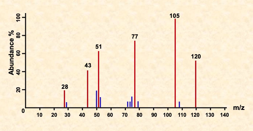Identify the fragments in the spectra for C6H5COCH3 shown below.