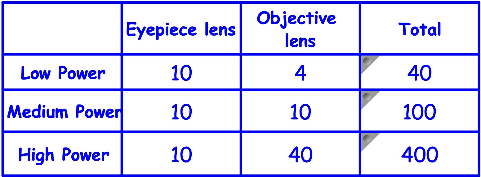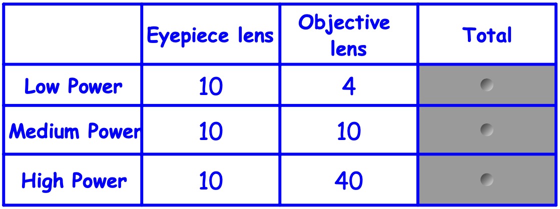 Look at the number written on the eyepiece lens and on the objective lenses. Then copy and complete the table: