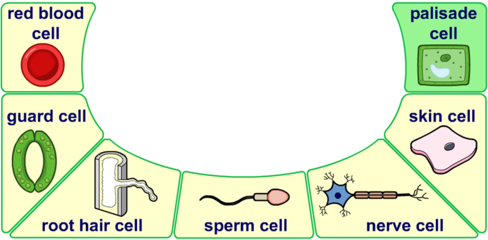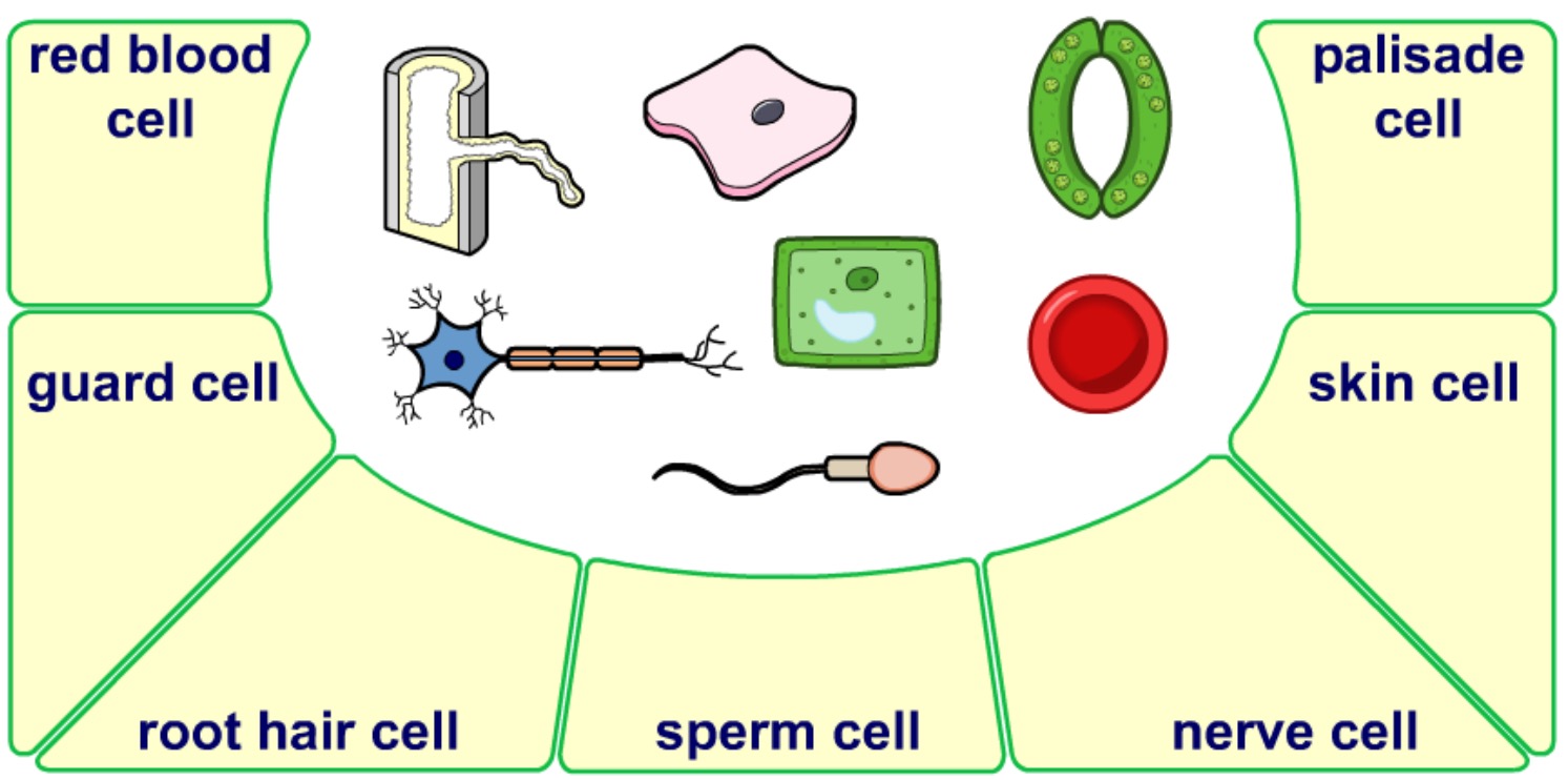Plant and animal cells are often different shapes and may not have all the usual cell structures. This allows them to carry out different jobs.