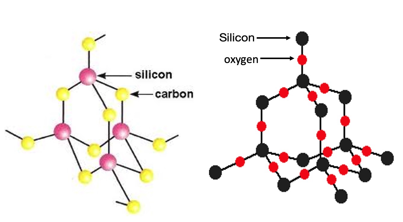 These covalent network compounds have the same properties as covalent network elements. Both SiC and SiO2 have very high melting points as melting requires breaking strong covalent bonds. Silicon carbide (structurally similar to diamond) has many uses due to it's strength, durability and low cost. Silicon carbide is often referred to as 'carborundum'