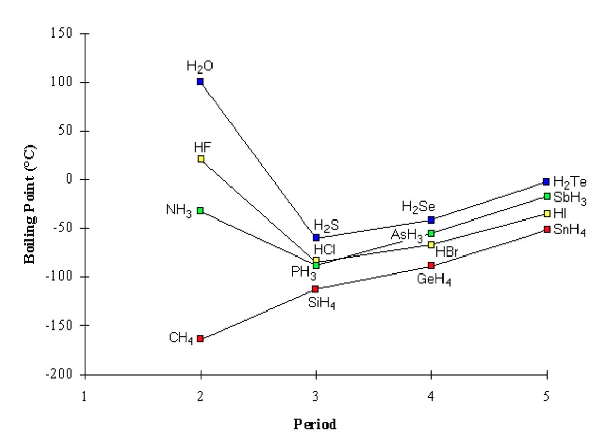 Water, hydrogen fluoride and ammonia have a boiling point higher than expected due to hydrogen bonding.