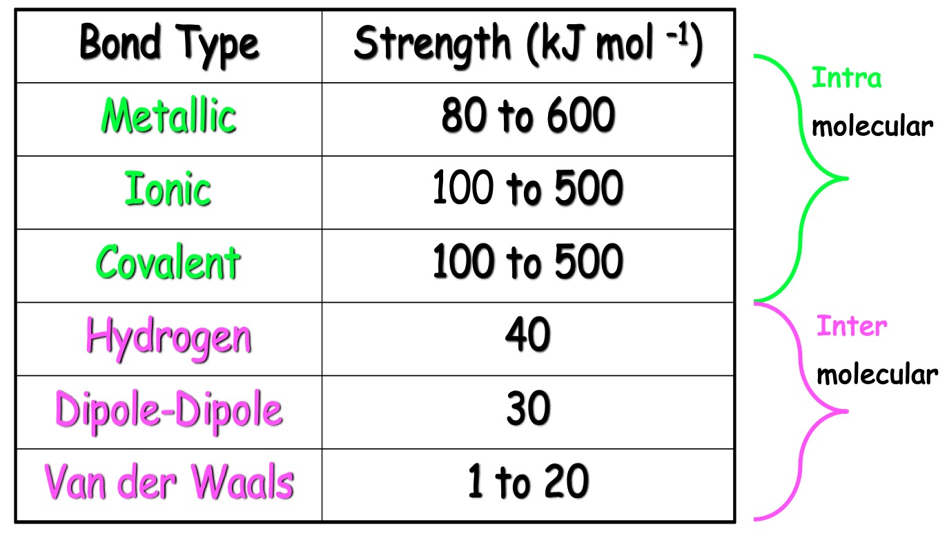 Covalent bonds are strong (100 to 500 kJ mol-1).
