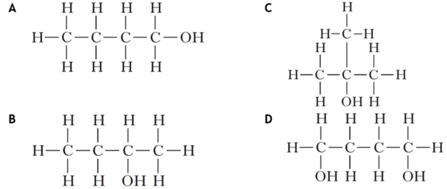 10. The structures for molecules of four liquids are shown below. Identify which liquid will be the most viscous.