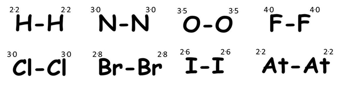 All diatomic elements contain pure covalent bonds as both atoms have the same electronegativity value.