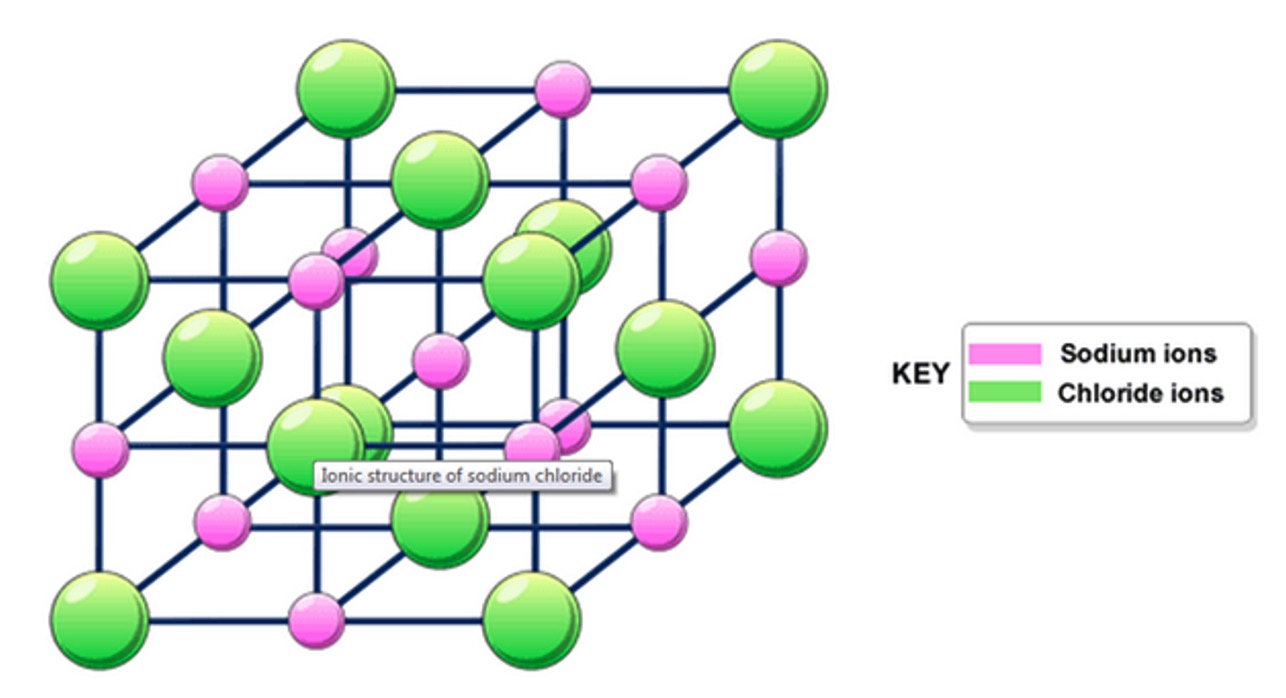 Ionic bonds are strong (100 to 450 kJ mol-1) and ionic compounds exist as crystal lattice structures in which each ion is attracted to a number of oppositely charged ions.