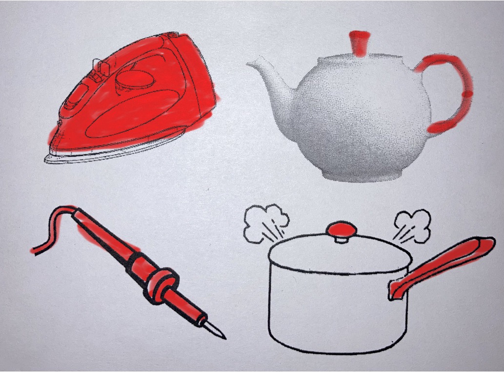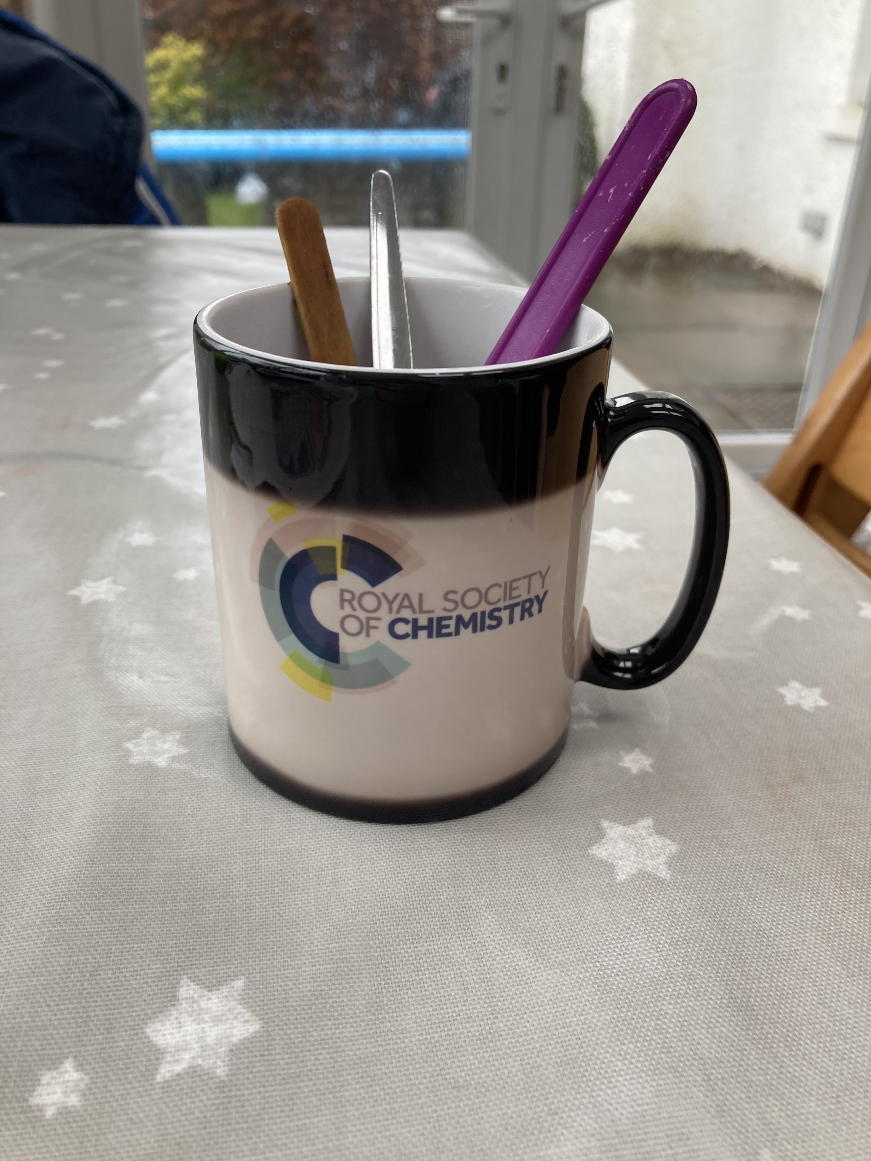 Place the metal spoon, wooden spoon and plastic spoon into a mug with hot water.