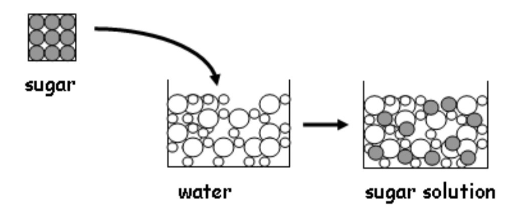 When you put a crystal of a solid e.g. sugar into water it dissolves.