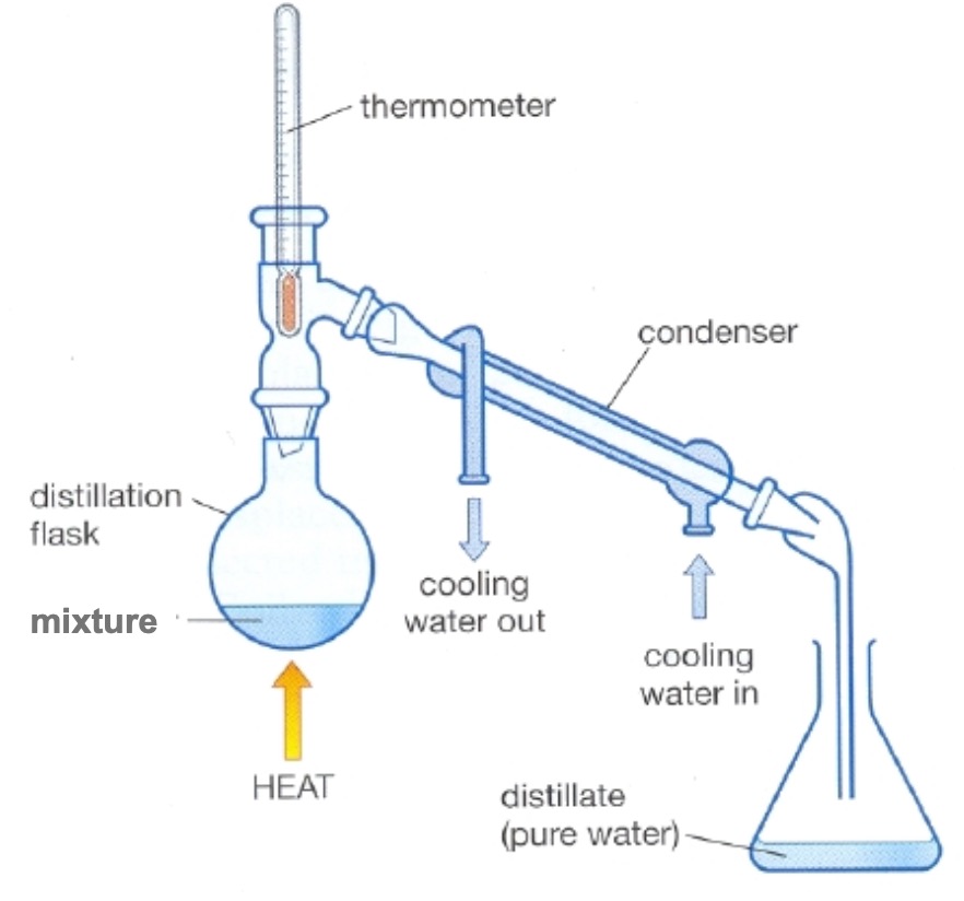 In distillation, the water is evaporated, then the steam (water vapour) is condensed.